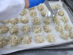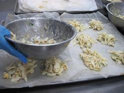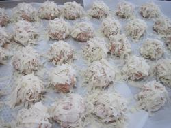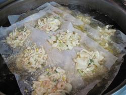 そのため厚さが出ず、ちょっと平たい形になってしまったので、クッキングシート1枚に、いつもは、8枚のるのですが、今日は6枚しかのらず、揚げ時間がいつもよりも1.4倍位かかってしまいました。