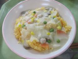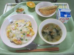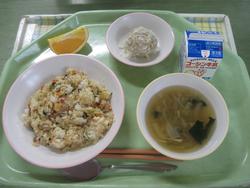 今日は、キャロットライスのクリームソースがけ ししゃものパリパリ揚げ フレンチサラダ メキシカンスープ 菊花みかん 牛乳でした。