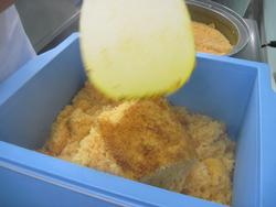 もろこしご飯のコーンはバターで炒め、ワカメご飯の具と合わせました。