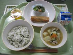 今日は、菜飯 鮭のチーズ春巻き もやしと青菜のサラダ 豚汁 オレンジゼリー 牛乳でした。