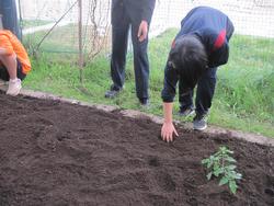 最初は、虫のチェックと土のほぐしをしてもらったのですが、水やりに来ていたIくん、そして準メンバー2人と4人もいるので、じゃあ、土をフカフカにするピートモスを入れようか。という事になりました。