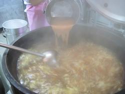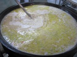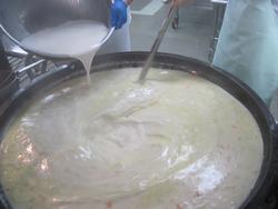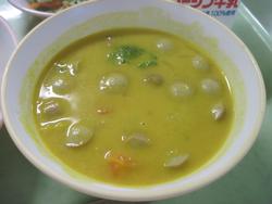 クラムチャウダーです。まだサラサラの液体です。