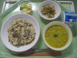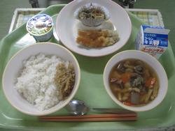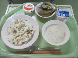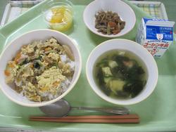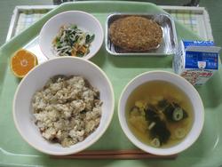 今日は、きんぴらご飯 2年2組Nくんの枝豆とキャベツのメンチカツ なめたけ和え かきたま汁 菊花みかん 牛乳でした。