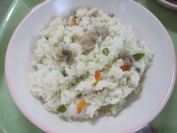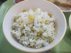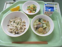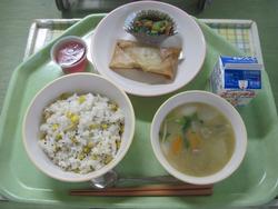 今日は、ガーリックライス ししゃもの磯辺揚げ 大根じゃこサラダ クラムチャウダー アセロラゼリー 牛乳でした。
