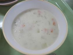 給食の時間になり、クラムチャウダーをスプーンで一口食べてみました。