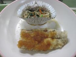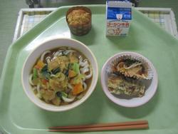 今日は、カレーうどん ちくわの磯辺揚げ マンナンサラダ 2年4組Tさんのさつま芋のマフィン 牛乳でした。