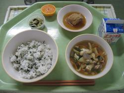 今日は、ごはん 高菜の油いため さつま揚げ 小松菜のごま和え 京風団子汁 牛乳でした。