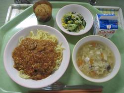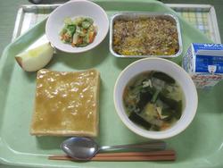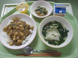 今日は、マーボー丼 ナムル 2年1組のSくんのぎょうざと空心菜のスープ オレンジゼリー 牛乳でした。