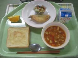 今日はセサミパン 2年2組のOさんのほくごろかぼちゃ焼きコロッケ フレンチサラダ 鶏肉と厚揚げのスープ りんご 牛乳でした。