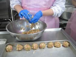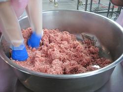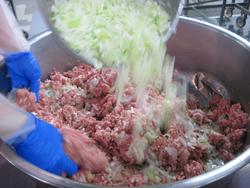 まず、挽肉を練っていきます。冬はこのお肉もかなり冷たくて硬いんです。
