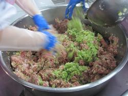 そして、今度はキャベツを、そしてしょう油や紹興酒の調味料を加え、またまた練ります。