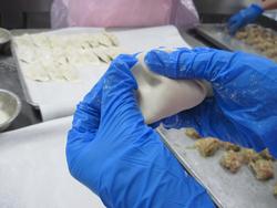 そして、今度はぎょうざの皮で包みます。ひだは3個で包んでもらいました。