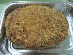 いつもは、グラタン皿の周りに隙間がある状態なのに、今日は、一個のメンチでパンパンです。