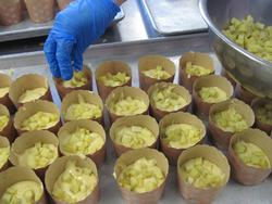 今日は、皮つきのかぼちゃを蒸してつぶし、上をスプーン2本で平にしていきます。