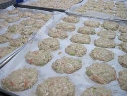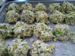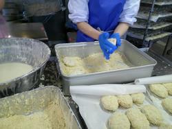 さつま揚げは調理員さんの手づくりです。たらと鰯のすり身と枝豆、ごぼう、にんじんなどの具材と混ぜたらクッキングシートに並べて油で揚げます。