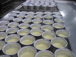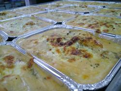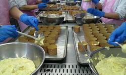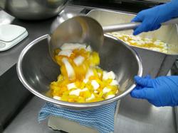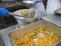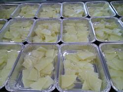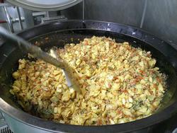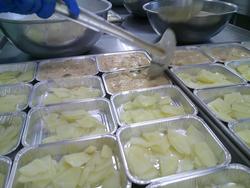 去年の人気だった南中メニューのトマトグラタンです。まず、トレーに蒸したジャガイモを敷いて・・・