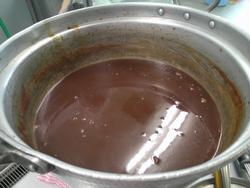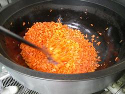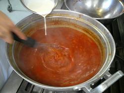 具材を煮て、手作りホワイトソースにトマト缶を入れてオレンジ色のソースを作ります。
