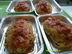 サラダをアルミカップに盛り付け、中皿にフライとサラダを盛り付け、ソースをかけて出来上がりです。