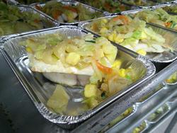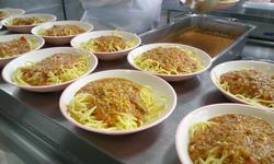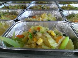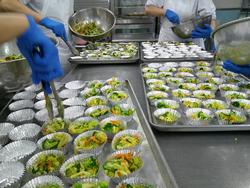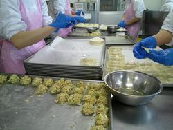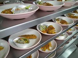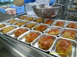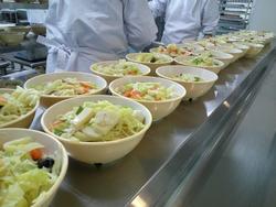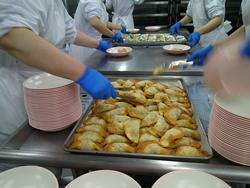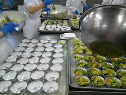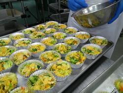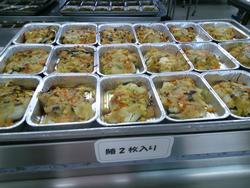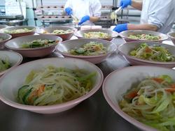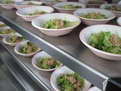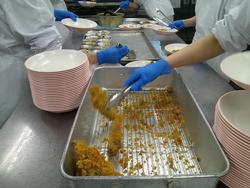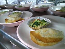 ぎょうざと和え物の盛り付けもあっという間に終わりました。調理師さんたちの盛り付け、本当に早いんです。