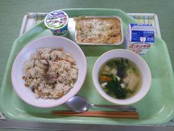 今日の献立は 舞茸ピラフ 3年4組のOさんのかぶのトマトグラタン 豆腐のとろみスープ ヨーグルト 牛乳 です。
