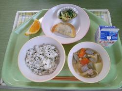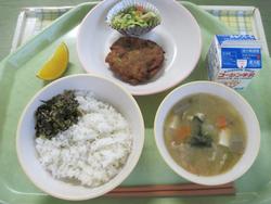 今日の献立は じゃこ菜ごはん はんぺんチーズフライ カリポリサラダ けんちん汁 ブルーベリーゼリー 牛乳 です。