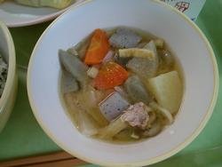 今日の汁物はダイコンやブナシメジなどの野菜とこんにゃくや鶏肉を煮込んで・・・