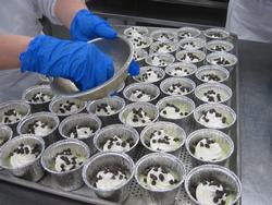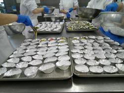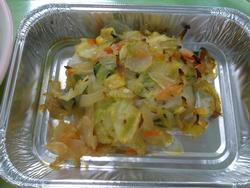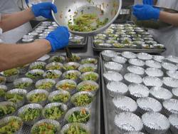 こまつなのごまあえは野菜とドレッシングやごまとあえて、アルミカップに盛り付けます。