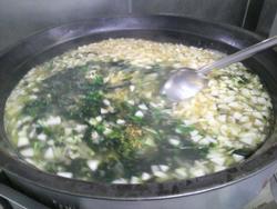 ピリ辛わかめスープを作ってるところです。白いのは豆腐、赤く見えるのは豆板醤です。ほど良い辛さです。