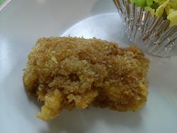フライは衣にパン粉とプレーンのコーンフレークを使っているので、サクサクの食感です。あじの身は厚くてふわふわでした。