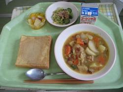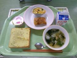 今日の献立はスィートポテトトースト イカフライ カリポリサラダ 豚肉とワカメのスープ アセロラゼリー 牛乳でした。