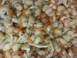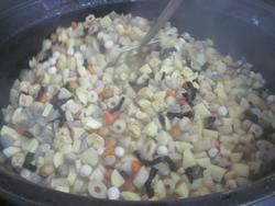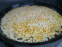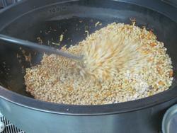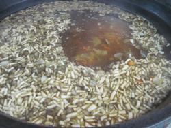 今日は煎り豆ではなく、乾燥の大豆を水に浸し、茹でて、片栗粉をまぶし揚げた物を具材の最後に入れた、おまめご飯です。