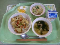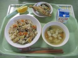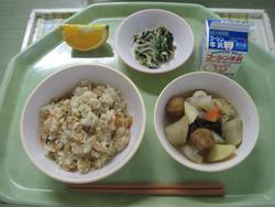 今日は、キムチピラフ ししゃもの磯辺フリッター ごまじゃこサラダ 鶏肉と豆腐のスープ オレンジ 牛乳でした。