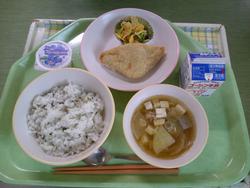 今日は 菜めし あじのコーンフレークフライ ごまじゃこサラダ おぼろけんちん汁 でこぽん 牛乳 です。