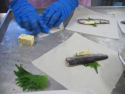 鰯の下味には、ゆかり粉だけを使い、しそとチーズを巻いて春巻きの皮で巻きました。