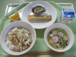 今日は、ひじきとベーコンのピラフ 3年2組Hさんのポテサラ春巻き フレンチサラダ アルファベットスープ グレープフルーツ 牛乳でした。