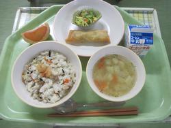 今日は、おまめご飯 鰯のゆかりチーズ春巻き 小松菜のみぞれ和え 節分汁 伊予柑 牛乳でした。
