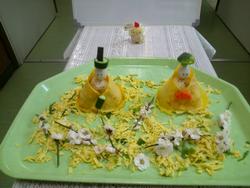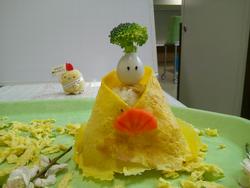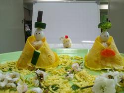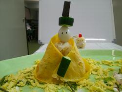 お雛様は、おにぎりはお寿司で作り、着物は薄焼き卵を1/2枚 扇は茹でた人参(後ろに爪楊枝を半分に切り、着物を止めています) 顔はうずら卵を下からつまようじを刺します。(尖った方が上です)冠はブロッコリーです。