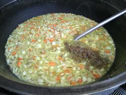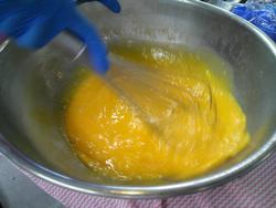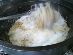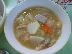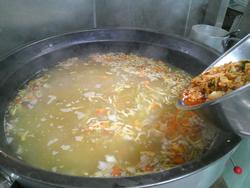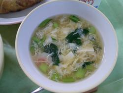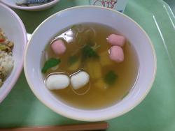 スープの中に綺麗に流れて入りました。学校では、冷凍の殺菌液卵を使うこともありますが、やっぱり、生の卵をが一番綺麗にスープの中に流れるなあと思います。