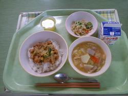 今日は、かき揚げ天丼 もやしときゅうりのごま酢和え 根菜のごまキムチ汁 オレンジゼリー 牛乳でした。