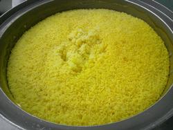 今日は、黄色のターメリックライスにしました。その上にトロリとカレーをかけました。