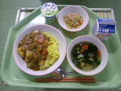 今日は、ターメリックライスのカレーライス 大根のじゃこサラダ 鶏肉のスープ ヨーグルト 牛乳でした。