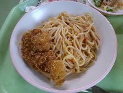 今日は、パスタの上にカリカリのクリスピーチキンを置きました。