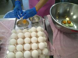 これは、スープの卵です。1個1個、血の付いた卵はないか?殻が入っていないかと確認しながら割ってくれていますよ。