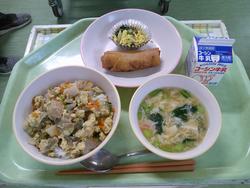 今日は、親子丼 キャベツと小松菜のごまがらめ 豆腐とえのきのすまし汁 さつま芋のデザート春巻き 牛乳でした。