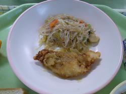 今日はハニーレモントースト 白身魚の立田揚げにんにくポン酢 春雨のピリ辛炒め 卵ワンタンスープ でこぽん 牛乳でした。