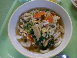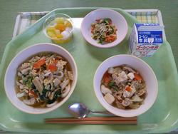 今日は、卵とじうどん じゃこサラダ 肉豆腐 フルーツ白玉 牛乳でした。