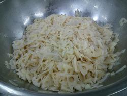 合わせ酢を作り、合わせ酢を少し取り、蓮根をその中に漬けておきました。
