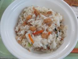 おまめご飯は、油揚げと野菜の具と、揚げた大豆に塩をからめ、ご飯に混ぜて作ります。