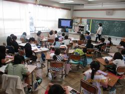 国語の「カタカナの書き取り」を3組の先生が授業し、他のクラスの児童はその配信をよく見て、しっかりと話を聞いて取り組んでいました。