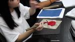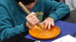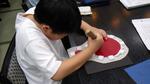 夕食の後は入浴。入浴が終わり、1日目の最後の活動「日光彫体験」。プレートに下描きしたデザインを、「ひっかき刀」という、日光彫独特の彫刻刀で彫っていきます。